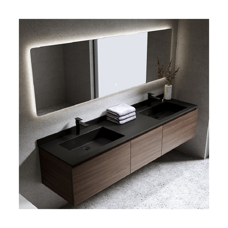 Vanidad del Baño presenta una elegante vanidad de doble fregadero montada en la pared para su baño 3